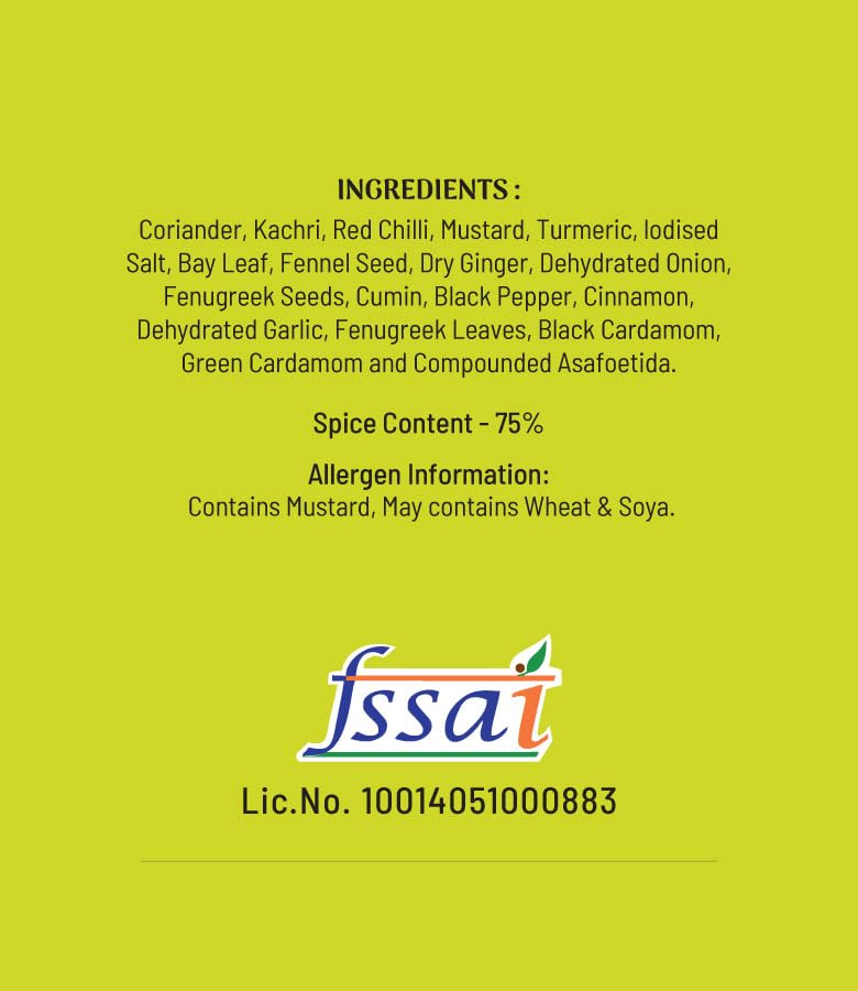 Coriander, Kachri, Red Chilli, Mustard, Turmeric, Common Salt, Bay Leaf, Fennel Seed, Dry Ginger, Dehydrated Onion, Fenugreek Seeds, Cumin, Black Pepper, Cinnamon, Dehydrated Garlic, Fenugreek Leaf, Black Cardamom, Green Cardamom, and Compounded Asafoetida